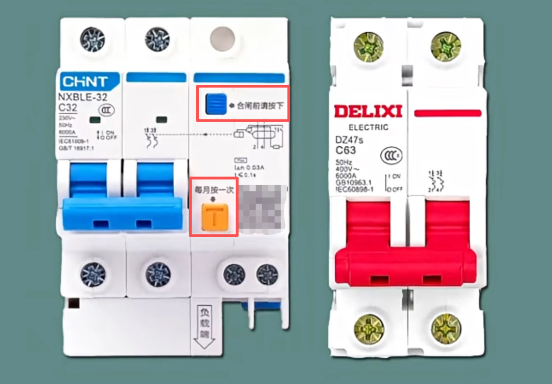 左为走电保护开关,右为空气开关