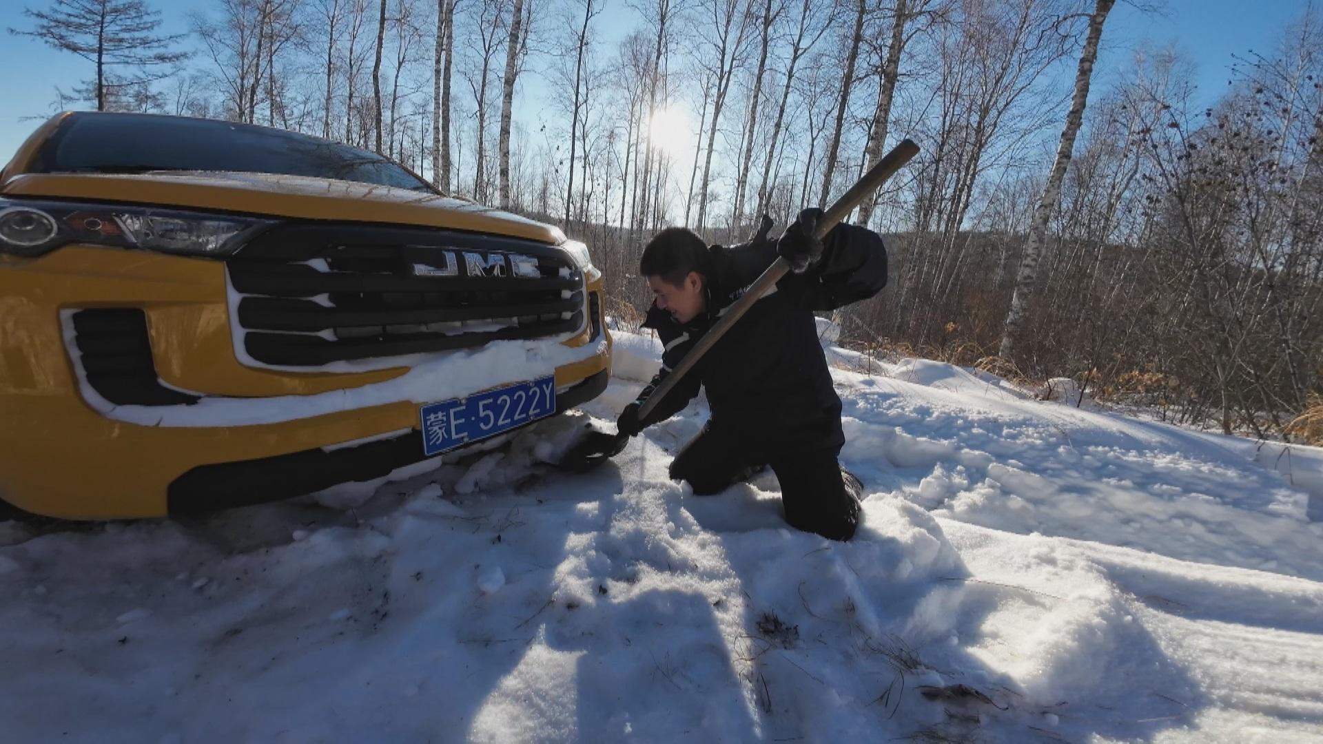 林间背阴路段日照少,积雪被车辆压实后又反复冻结。车辆行至一处背阴弯谈,莫得躲过躲闪的松软雪层,车先是猛地一顿,随后车轮启动空转,车辆陷在原地飞动不得。柴瑞峰取出铁锹从车轮下挖雪,十几分钟后,积雪才被计帐干净。