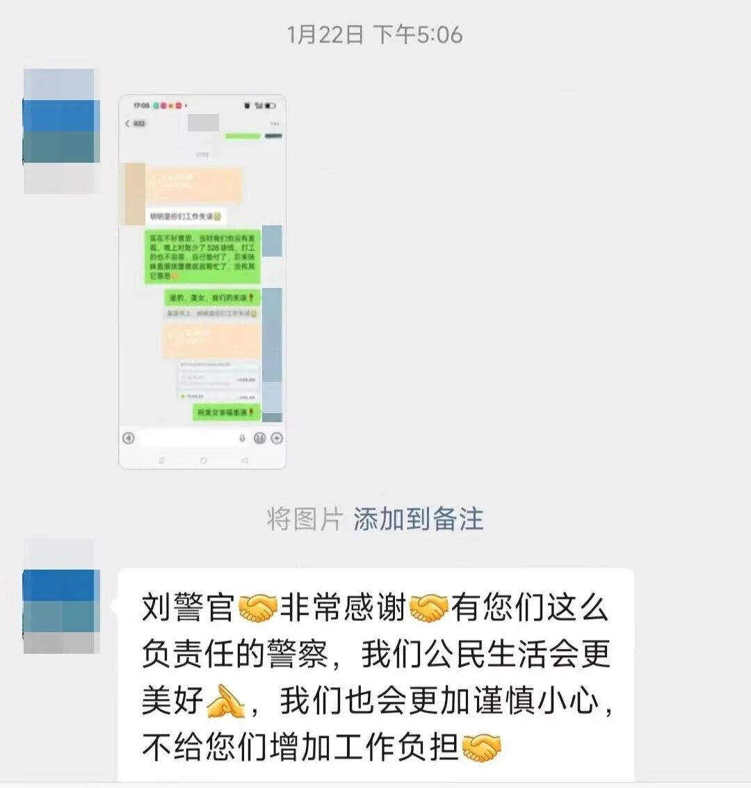 ▲辅警刘期胜匡助辖区商户追回的货款。