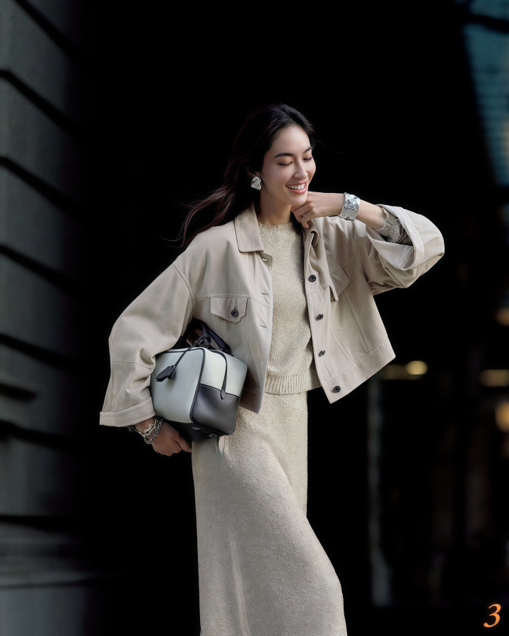 何况夹克的廓型还能让上半身显得愈加挺阔,再配上裙子的垂感,整套造型松而不垮,多礼但不拘束,畸形耐看。