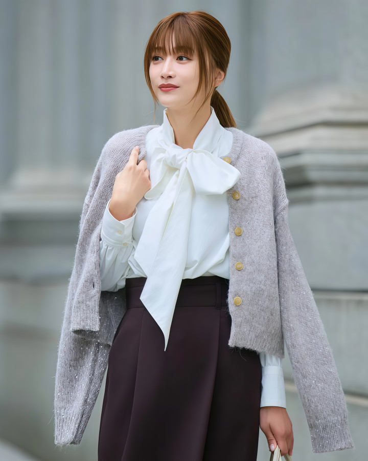 ② 软开衫配硬半裙,讲究全在细节里