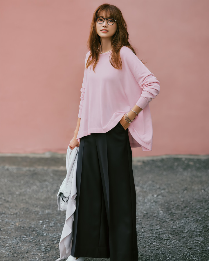 梨形骸格的姐妹,脏粉色阔腿裤大概会更合适你,裤管够宽够直,臀部和大腿的抽象全被裤子的廓形兜住了,走起路来裤脚带着微微的飘感,看着又瘦又答允。上衣塞进裤腰里,腰线的位置就出来了,显高显瘦两件事一步惩办。