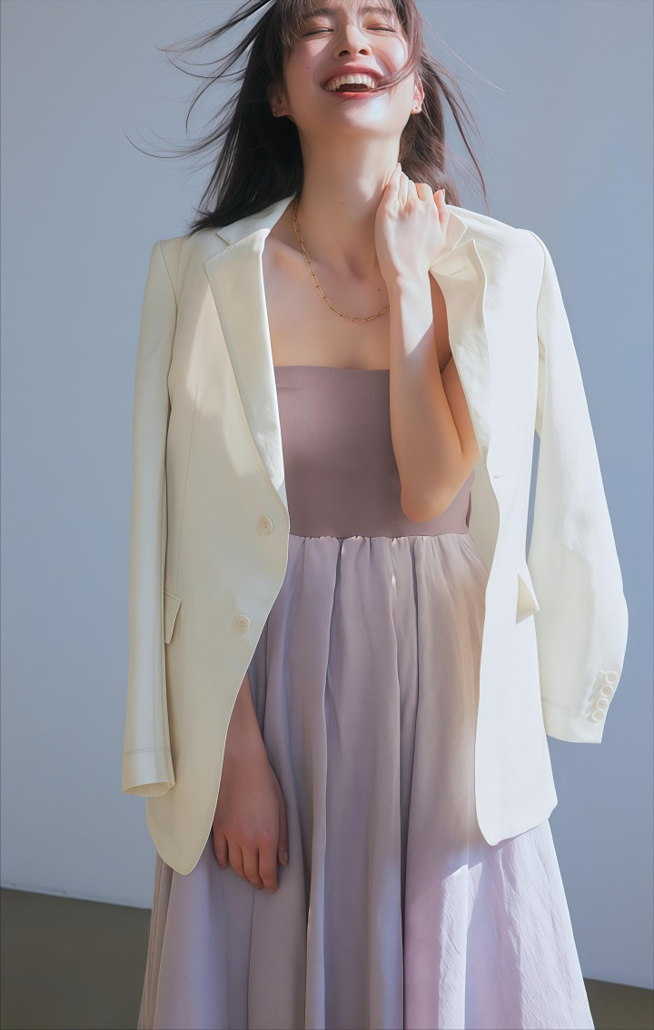 灰紫色最百搭的组合便是配白色,干净澄澈不会出错。白色西装外衣搭一件灰紫色的吊带裙或薄至意衫,西装的挺括撑住了骨架,灰紫的轻柔负责营造温度,这一组穿去上班、见客户皆很加分,显得这个东说念主有回味但不张扬。