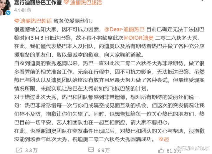 前几日迪丽热巴是要以迪奥全球品牌大使的身份,飞巴黎进入2026秋冬大秀,这但是前锋圈的顶级活动,她荟萃三年齐没缺席过,谁能料到,一场出乎意想的不测,让她的行程透彻被打乱。事情是这样的,2月28号她从北京启航,筹画经迪拜中转去巴黎,效果刚到迪拜,就遇上中东形势升级,好意思以对伊朗发动军事打击,阿联酋垂危关闭领空,迪拜机局面有航班一齐停飞,她就这样硬生生被卡在了迪拜,一困便是4天。更吓东谈主的是,3月1号迪拜机场还遇到了爆炸要紧,她住的酒店离爆炸点不远,格外于直面险境。