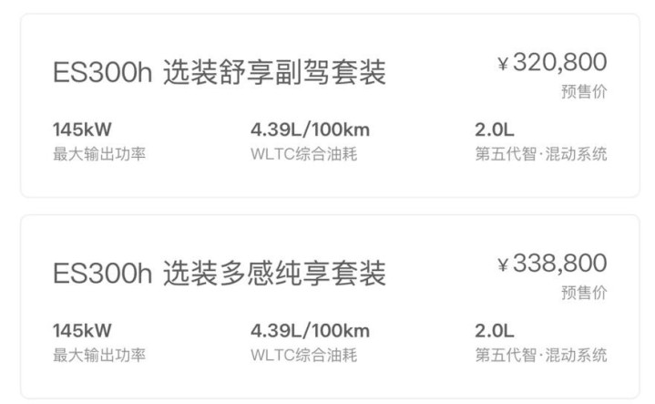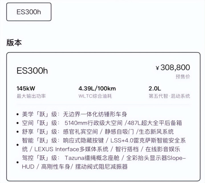 但问题出在能源和节拍上。ES300h搭载的2.0L混动系统,空洞功率145千瓦,0-100km/h加快9.4秒。这个数据放在2026年,确实拿不来源——20万级的国产纯电轿车仍是在玩“3秒级”加快了。行将推出的纯电版ES350e,电机功率165kW,加快8.9秒,比“网约车之王”埃安S还慢。