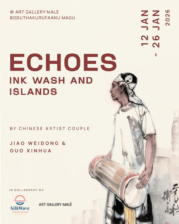 2026年抓续至1月26日,《回响——水墨与岛屿》(Echoes — Ink Wash & Islands)展览在马累艺术画廊(Art Gallery Male’)完结,现场呈现艺术家三十余幅水墨作品。