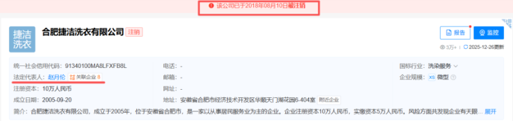 但天眼查信息清楚,赵月伦在2015年4月至2018年8月时辰仍在合肥捷洁洗衣有限公司任职,并担任该公规定定代表东谈主,直至2018年8月该公司刊出。高管中枢任职履历的流露时长存在三年多的互异。