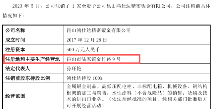 公开信息清楚,鸿仕达于2023年5月刊出了全资子公司昆山鸿仕达精密钣金有限公司,该子公司刊出前的主要权术地为昆山市陆家镇金竹路9号。与此同期,鸿仕达另一子公司鸿仕达精密机械的“零部件出产名堂环评文献”明确说起,“陆家镇金竹路9号为租用刊行东谈主房产”,且当今鸿仕达精密对外通讯地址仍登记为该地址。