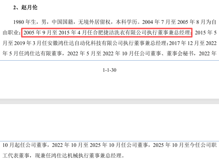 此外,鸿仕达高管任职流露的准确性也遭到质疑。招股书清楚,鸿仕达机械实施董事、总司理赵月伦2005年9月至2015年4月任合肥捷洁洗衣有限公司实施董事兼总司理,2015年5月后转入安徽鸿仕达自动化科技有限公司任职。