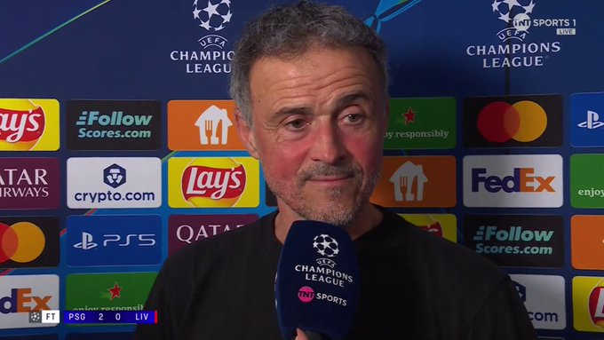 虎扑04月09日讯巴黎圣日耳曼主教授路易斯-恩里克在2-0打败利物浦的欧冠首回合赛后,摄取TNTSport采访。
