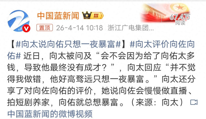 在2026年4月13日的视频中,向太陈岚公开月旦小犬子向佑“好高骛远,总念念整宿暴富”,效果一败涂地。