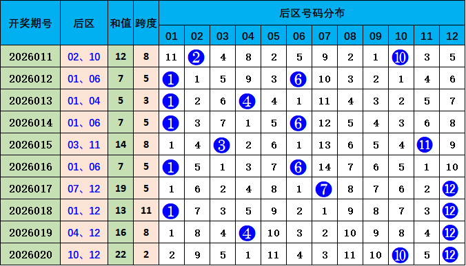 后区走势分析:上期开出10 12,开出和值22,较前一期和值高潮6个点位变化,本期计划和值下落,参考号码03 05,和值8。