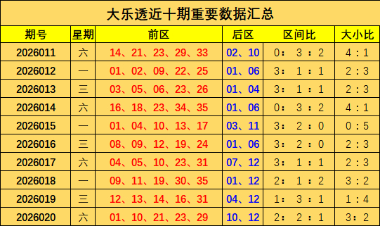 大乐透上期出奖号统计:前区01 10 21 23 29,后区10 12,三区比为2:2:1,大小比为3:2。