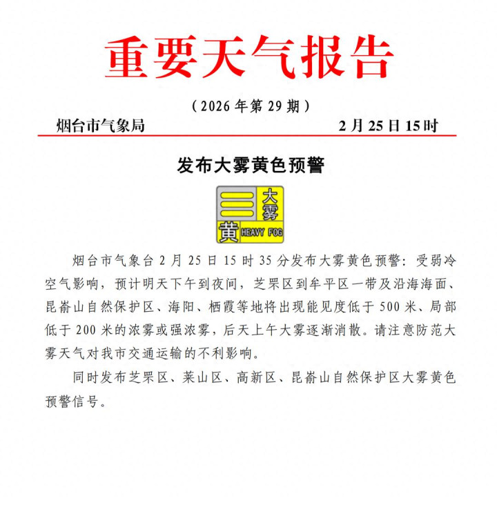 同期发布芝罘区、莱山区、高新区、昆嵛山当然保护区大雾黄色预警信号。