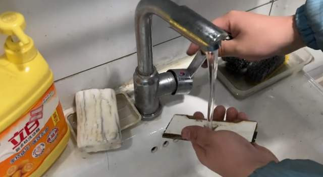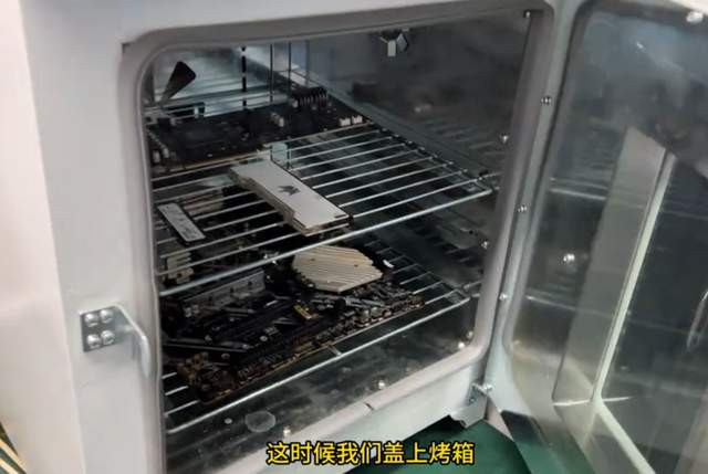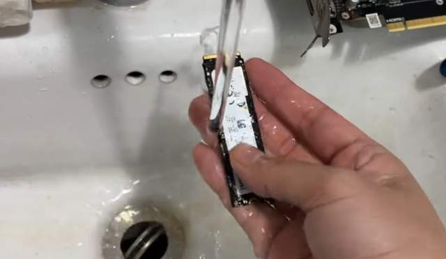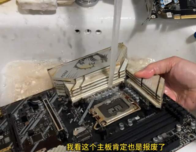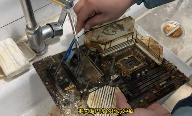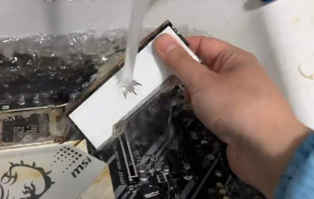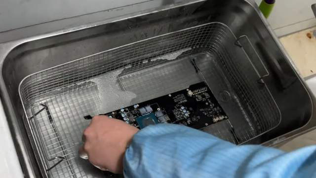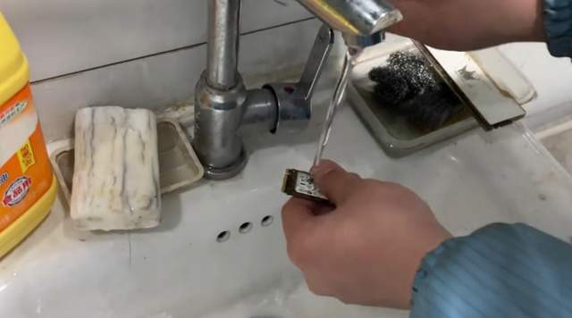 硬盘、内存条和主板也齐上了“洗洁精”+“牙刷”的组合清洁套餐,褪去了身上的泥沙之后,沿途放进“超声波水槽”。(就这责任台,也太好像了点,像极了某公厕的洗手台哈哈哈)