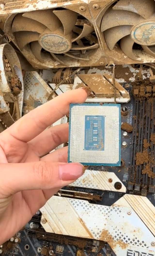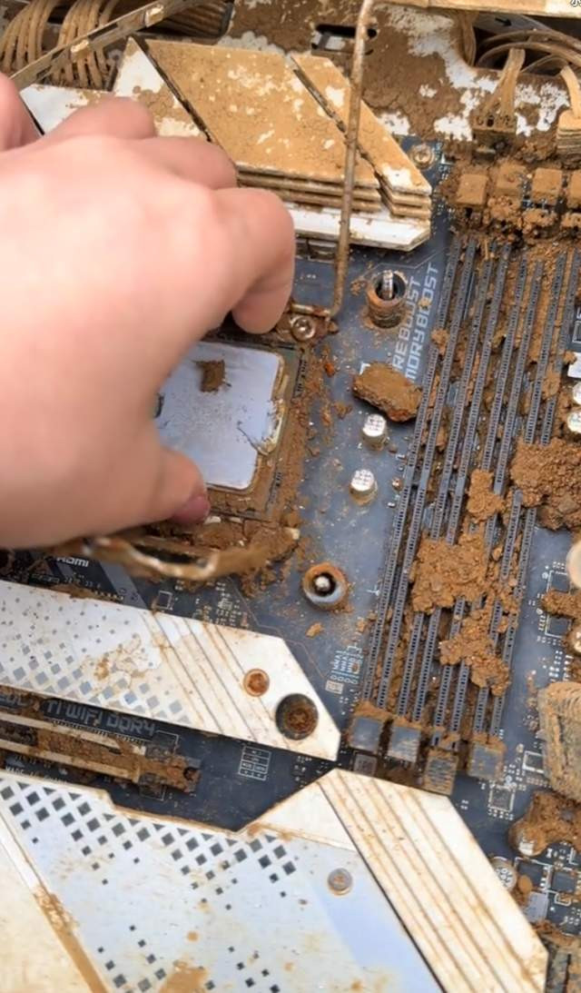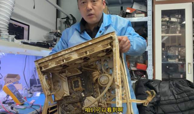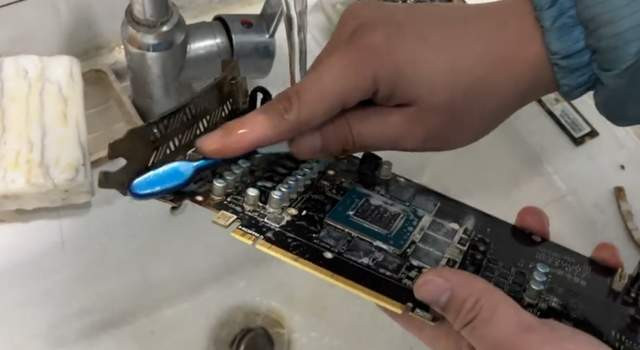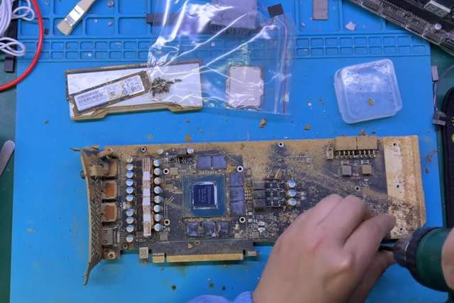 干系词这并莫得吓到咱们张哥,只见他“库库”一顿拆,很快显卡的主板就泄露了出来。这布满泥沙的主板,谁看了不摇头。