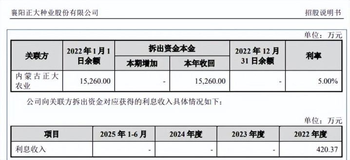 曾拆出资金1.526亿元。敷陈期内,正大种业存在资金拆出,2022岁首对内蒙古正大农业有限公司(内蒙古正大农业)拆出余额为15,260万元,当期偿还已毕,以5%利率蓄意,得到利息收入420.37万元。