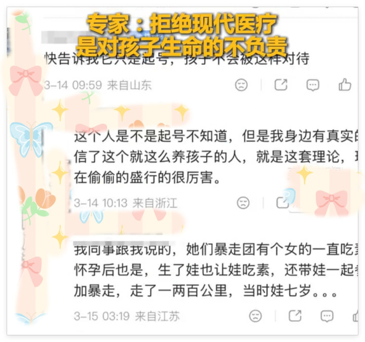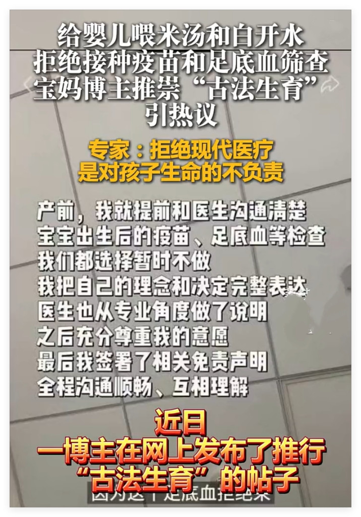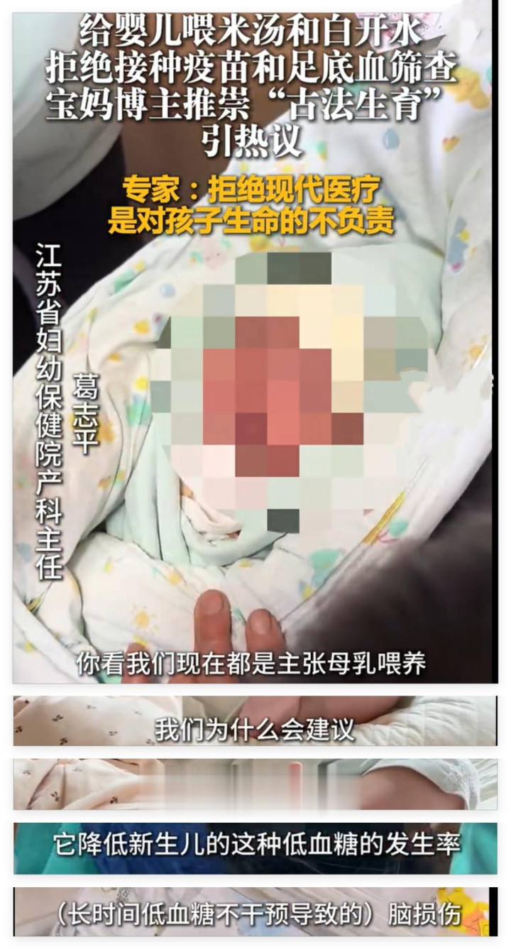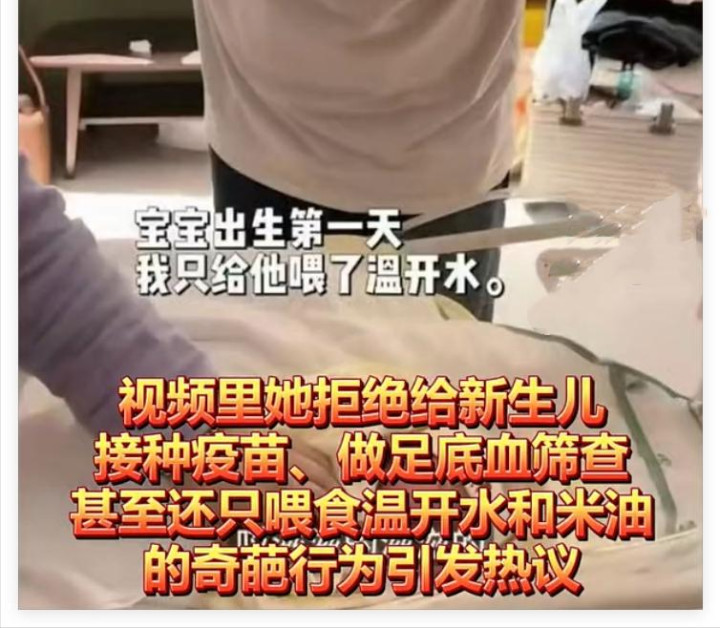 一位有30万粉丝的宝妈博主,在网上本质所谓的“古法生养”——重生儿出死后两天只喂白热水和米汤,间隔作念足底血筛查,间隔接种疫苗。