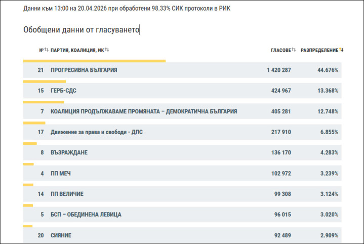 保加利亚中央选举委员会已统计卓越98%的选票,“朝上保加利亚”以44.7%的得票率排在第一位。英国《卫报》指出,这意味着,拉德夫指点的政党定约有望得回保加利亚国民议会240个议席中至少130个,戒指议会半数以上的席位。